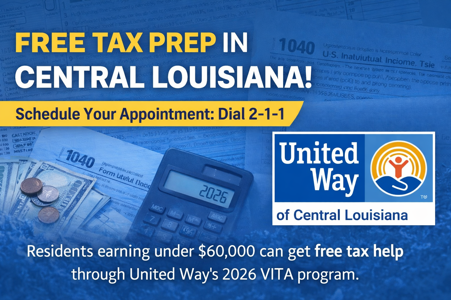 Alexandria, La. (2/13/2026) — Free tax prep in Central Louisiana is now available through United Way of Central Louisiana’s 2026 VITA program.