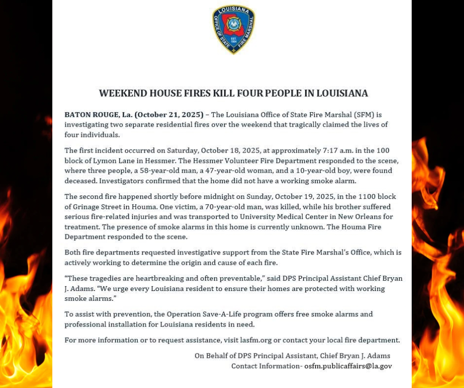 Hessmer, LA (October 21, 2025) – The Louisiana Office of State Fire Marshal (SFM) is investigating two separate residential fires over the weekend that left four people dead, including a child, in Hessmer and Houma.